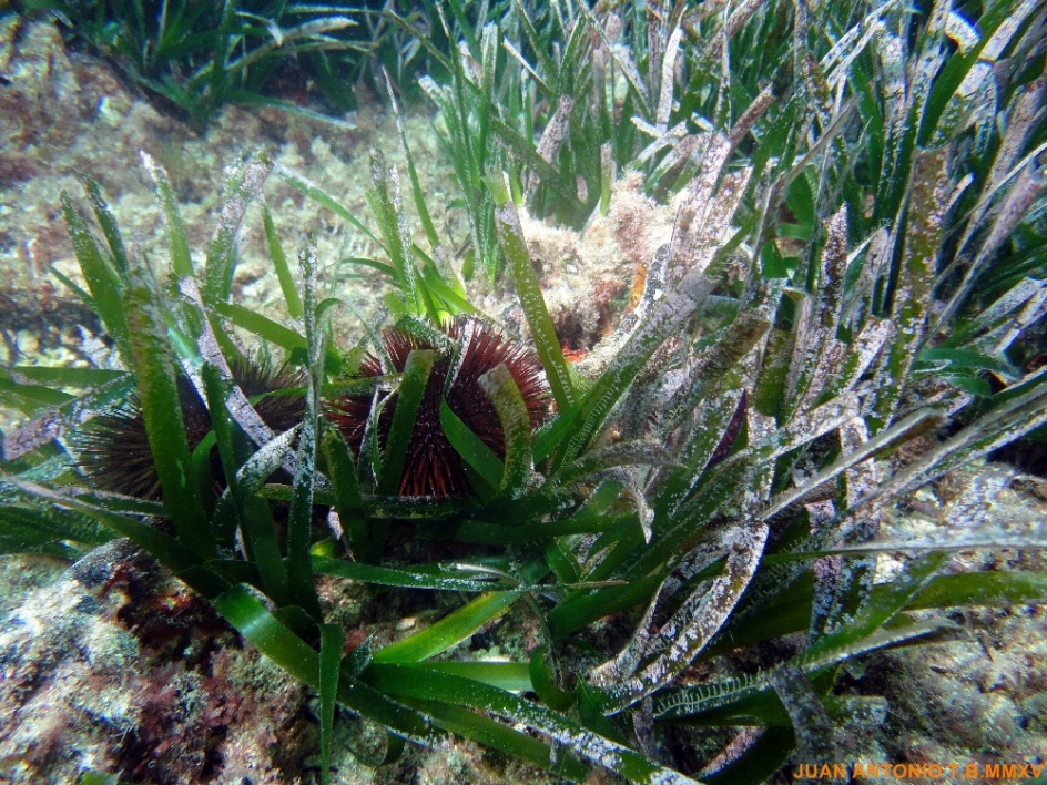 este es un fondo de posidonia donde se puede ver unos erizos comunes.