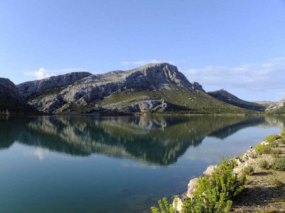 Sa Rateta i l'Ofre s'emmirallen a les aigües tranquil·les del pantà de Cúber. (127/abril/2014).